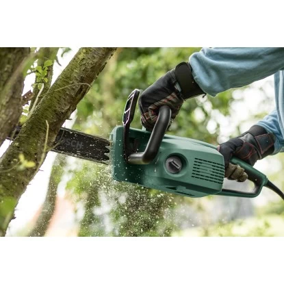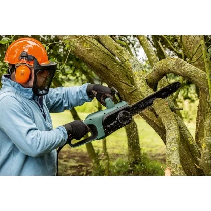 Die kabelgebundene Bosch Elektro-Kettensäge UniversalChain 35 hat ein geringes Gewicht von nur 4,2 kg und ist ergonomisch für optimalen Benutzerkomfort geformt. Ein leistungsstarker 1.800 W-Motor mit einer Kettengeschwindigkeit von 12 m/s sorgt für schnelle Schnitte. Boschs kompaktes SDS-System ermöglicht ein werkzeugloses und einfaches Spannen und Warten der Kette. Dank eines großen, seitlich ausgerichteten Ölbehälters mit gut zugänglichem Verschluss ist ein einfaches Nachfüllen des automatisch arbeitenden Kettenschmiersystems garantiert. Mit einer stabilen Rückschlagbremse zum wirkungsvollen Stoppen der Kette ist für die erforderliche Sicherheit gesorgt. Diese Kettensäge ist leicht zu bedienen und zu bewegen und daher ideal zum Sägen von Baumstämmen, dicken Ästen und kleinen bis mittelgroßen Bäumen.