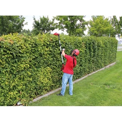 Der von 88 cm bis 184 cm stufenlos arretierbare Teleskopstiel lässt sich passgenau auf die gewünschte Arbeitshöhe einstellen. Der ebenfalls stufenlos verstellbare Zusatzhandgriff wird mit dem praktischen Schnellverschluss auf jeden Anwender angepasst. Um auch schwierige Schnitte in der Höhe sauber und präzise ausführen zu können, lassen sich der Motorkopf 7-fach und der Hauptgriff 4-fach neigen und somit auf jede Arbeitssituation abstimmen. Der Kettensägen-Aufsatz verfügt dabei über eine Schnittlänge von 17 cm und der Aufsatz der Heckenschere über eine Schnittlänge von 40 cm. Danke seines geringen Gewichts von gerade einmal 7 kg liegt der Akku Hochentaster zu jedem Zeitpunkt ausgezeichnet in der Hand und sorgt für eine ermüdungsfreie Anwendung.