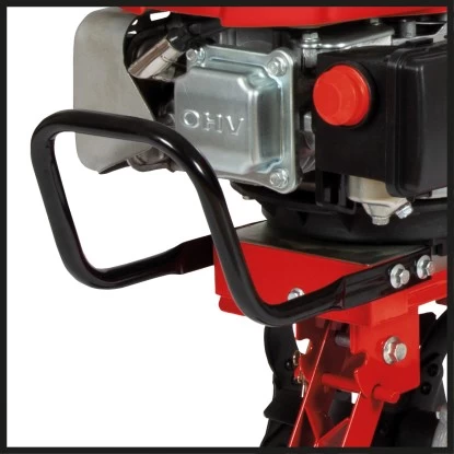 Zur sicheren Bedienung ist das Gerät mit einem Hackmesserstop ausgerüstet. Sobald der Schalter losgelassen wird, setzt eine sogenannte Totmann-Schaltung die Messer sofort außer Betrieb. Das stabile schwenkbare Führungsrad sorgt für bequemen und mühelosen Standortwechsel. Dank ergonomischer, höhenverstellbarer Führungsgriffe lässt sich die Bodenhacke optimal an jede Körpergröße anpassen.