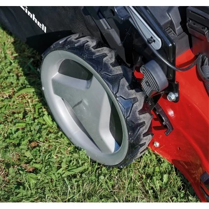 Der optionale Startseilzug ist gut erreichbar am ergonomischen Führungsholm angebracht, der dank Softgrip und dreistufiger Höhenverstellung viel Bedienkomfort bietet und sich zudem für die platzsparende Unterbringung einklappen lässt. Der abschaltbare Hinterradantrieb ermöglicht kontinuierlichen Vorschub und erleichtert zudem das Mähen auf großen Flächen.
