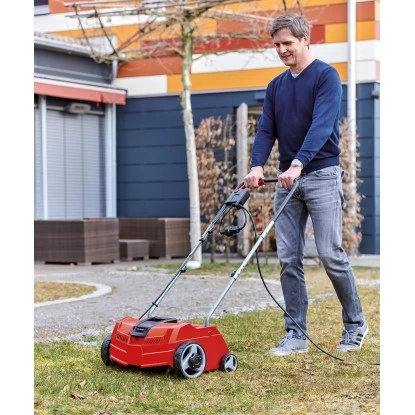 Der Einhell Elektro-Vertikutierer GC-ES 1231/1 ist ein leistungsstarkes und zuverlässiges Gartengerät, das sich beim fachgerechten Vertikutieren kleinerer bis mittlerer Bodenflächen für einen gesunden Rasen als unentbehrlicher Helfer erweist. Mit 8 hochwertigen Doppelmessern rückt die kugelgelagerte Messerwalze Unkraut und Moos samt Wurzel sehr effektiv zu Leibe. Dabei liefert der kraftvolle Reihenschlussmotor mit 1.200 W ein starkes Drehmoment für kontinuierlichen Arbeitsfortschritt und einheitlich gute Resultate.